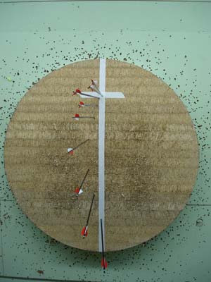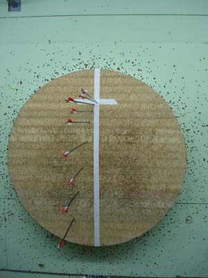 Um den Berger-Test vernünftig durchführen zu können, braucht ihr neben eurem Bogen mindestens 8 identische Pfeile. Und ich meine identisch. Wenn ihr mit 4 verschiedenen Spitzen und 6 unterschiedlichen Befiederungen schießt, dann verspreche ich euch, dass ihr eher die Rente erreicht, als einen sauber abgestimmten Bogen. Außerdem benötigt ihr noch ein paar Meter Malerkrepp oder ähnliches.