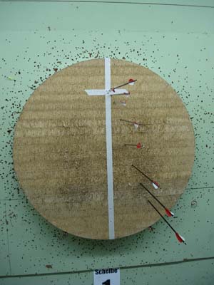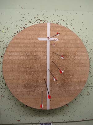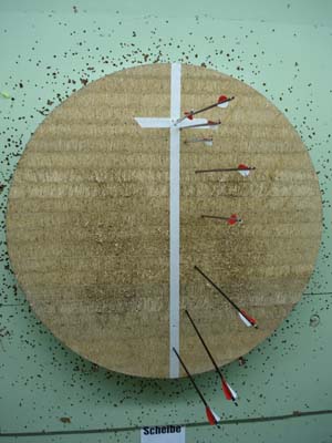 Den ersten Pfeil schießt ihr von 5m. Abhängig von der Anzahl der Pfeile und den Platzmöglichkeiten wählt ihr die Abstände zum nächsten „Abschussort“. In der Halle schieße ich alle 3m und draußen alle 5m. Sinnvoll sind Entfernungen bis maximal 30m in der Halle und 45m draußen. Bei den großen Entfernungen solltet ihr oberhalb der Schnittlinie anhalten, damit die Pfeile keinen Schaden nehmen.
